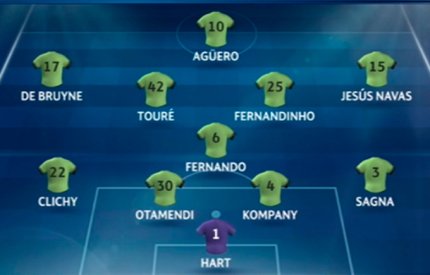 Манчестер Сити: 1. Харт - 3. Санья, 30. Отаменди, 4. Компани (к) (20. Мангаля, 10'), 22. Клиши; 6. Фернандо, 25. Фернандиньо; 15. Хесус Навас (72. Ихеаначо, 69'), 42. Туре (7. Стерлинг, 61'), 17. де Брюйне; 10, Агуэро