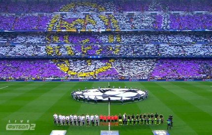 21:43. слушаем гимн Лиги чемпионов. А болельщики делают яркое модульное шоу