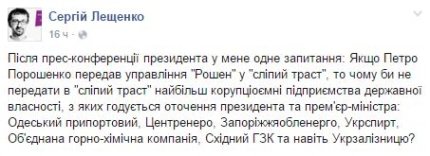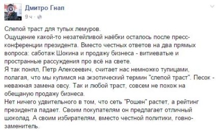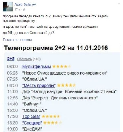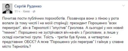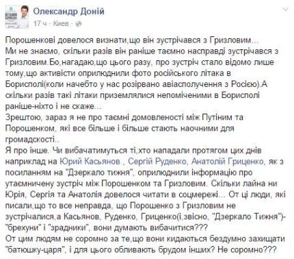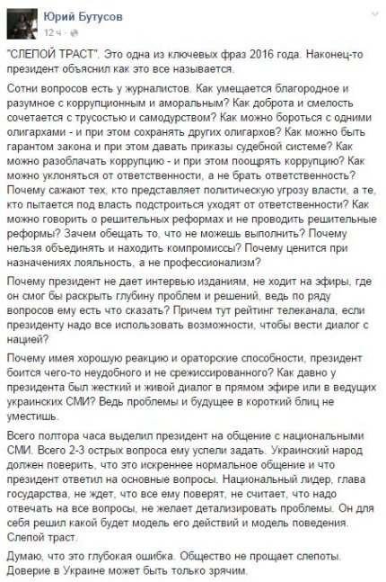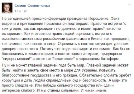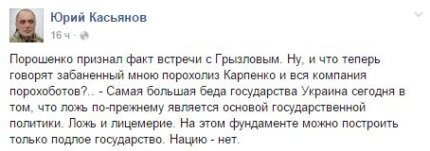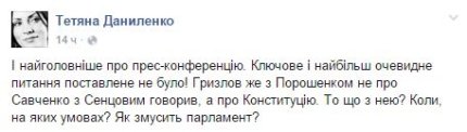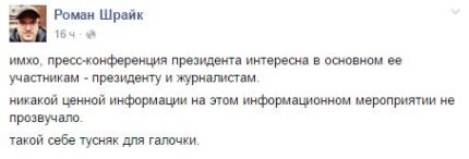 На ней президент был, как обычно, красноречив, говорил о приоритетах на 2016 год, о судьбе оккупированного Крыма и Донбасса, о Минских договоренностях, о правительстве и реформе ГПУ. Главным достижением Порошенко назвал преодоление зависимости от российского газа. Но бурное обсуждение в украинском обществе вызвало признание главы государства о тайной встрече в Киеве с участником Трехсторонней контактной группы от РФ Борисом Грызловым.
