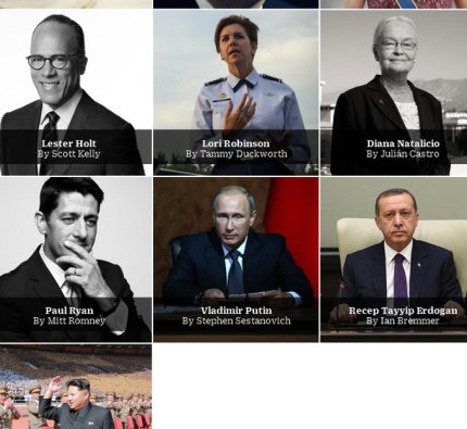 Седьмым в рейтинге оказался сенатор от штата Вермонт Берни Сандерс, восьмым - американский военный Шон МакФарланд, девятая - новый президент Тайваня Цай Инг-вен, десятым - представитель представитель Республиканского национального комитета Рейнс Прибас.