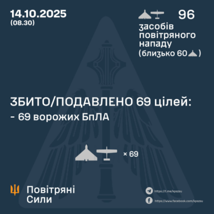 По предварительным данным, по состоянию на 08:30, противовоздушной обороной сбито/подавлено 69 вражеских БпЛА типа Shahed, Гербера и дронов других типов на севере, юге, востоке и центре страны.