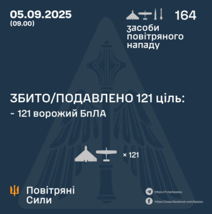 По предварительным данным, по состоянию на 09.00, противовоздушной обороной сбит/подавлен 121 вражеский БпЛА типа Shahed и дроны-имитаторы разных типов на севере и востоке страны.
