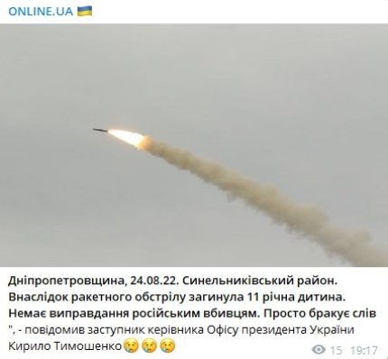 Днепропетровщина, 24.08.22. Синельниковский район. В результате ракетных обстрелов погиб 11-летний ребенок. Нет оправдания российским убийцам. Просто не хватает слов, – сообщил заместитель руководителя Офиса президента Украины Кирилл Тимошенко.