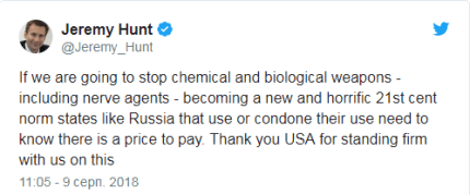 "Если мы собираемся не дать химическому и биологическому оружию, в частности нервно-паралитическим агентам, стать новой ужасающей нормой 21-го века, такие государства, как Россия, которые используют или способствуют их применению, должны знать, что за это нужно заплатить цену. Спасибо США, что решительно стоят рядом с нами относительно этого", - написал Хант.