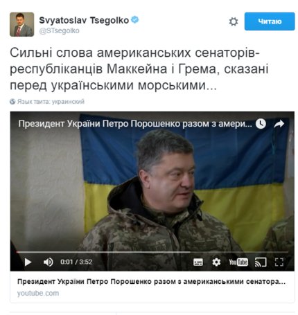 Об этом сообщает ONLINE.UA со ссылкой на Twitter пресс-секретаря президента Украины Петра Порошенко Святослава Цеголко.
