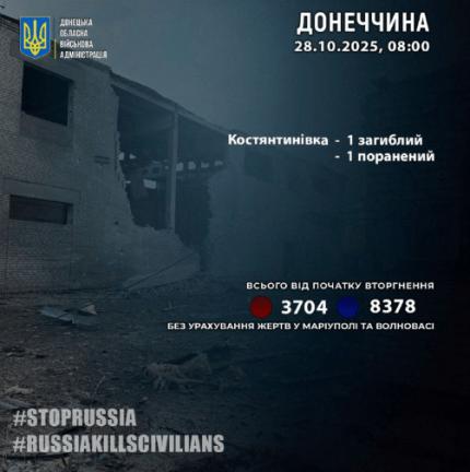 Глава Донецкой ОВА Вадим Филашкин официально подтвердил, что за прошедшие сутки россияне убили одного мирного жителя области — в Константиновке. Еще один гражданский получил ранение.