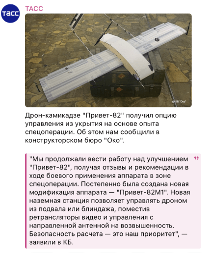 Мы продолжали работать над улучшением "Привет-82", получая отзывы и рекомендации во время боевого применения аппарата в зоне спецоперации. Постепенно была создана новая модификация аппарата - "Привет-82М1", - сообщили в конструкторском бюро.