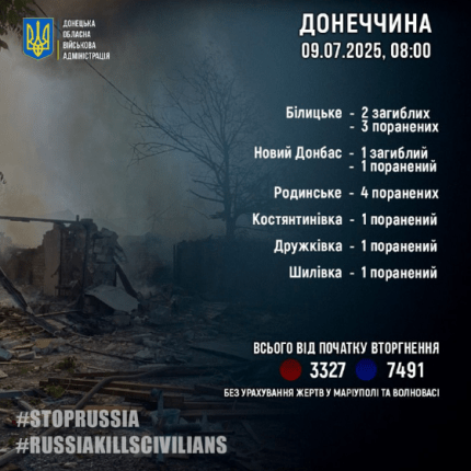 За 8 июля россияне убили 3 жителей Донецкой области: 2 в Белицком и 1 в Новом Донбассе. Еще 11 человек в области за сутки получили ранения.