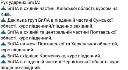 06:38 — БпЛА на границе Черниговской и Киевской областей, курс северо-западный. Кроме того, вражеские дроны снова были замечены в Полтавской области, они постоянно меняли курс.