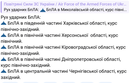 00:06: Движение ударных БпЛА: БпЛА в южной части Черниговщины, курс западный/юго-западный.. БпЛА на границе Харьковщины и Полтавщины, курс южный. БПЛА на севере Полтавщины, курс южный.