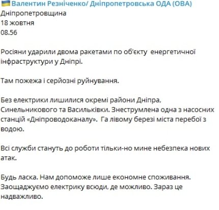 Без электричества остались отдельные районы Днепра, Синельниково и Васильковки. Обесточена одна из насосных станций «Днепропроводканала». На левом берегу города Днепра перебои с водой. Все службы приступят к работе как только минует опасность новых атак. Пожалуйста, экономим электричество повсюду, где это возможно. Сейчас это очень важно, - подчеркнул глава Днепропетровской ОВА Валентин Резниченко.