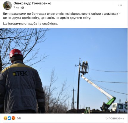 Бить ракетами по бригадам электриков, восстанавливающим свет в домах – это не вторая армия мира, это даже не армия второго мира. Это историческая стыда и слабость, – подчеркнул мэр Краматорска Александр Гончаренко.