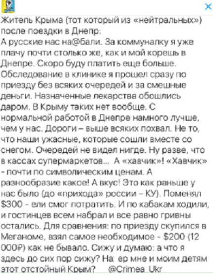 "А русские нас на*али. За коммуналку я уже плачу почти столько же, как и мой кореш в Днепре. Скоро буду платить еще больше. Обследование в клинике я прошел сразу по приезду без всяких очередей и за смешные деньги. Назначенные лекарства обошлись даром. В Крыму таких нет вообще. С нормальной работой в Днепре намного лучше, чем у нас. Дороги - выше всяких похвал. Не то, что наши ужасные, которые сошли вместе со снегом", - поделился крымчанин впечатлениями от поездки в Днепр.