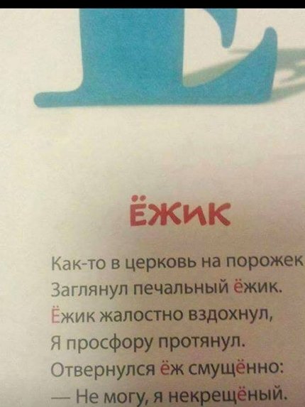 В сети появилось фото нового российского букваря, который повествует о некрещеном ёжике.
