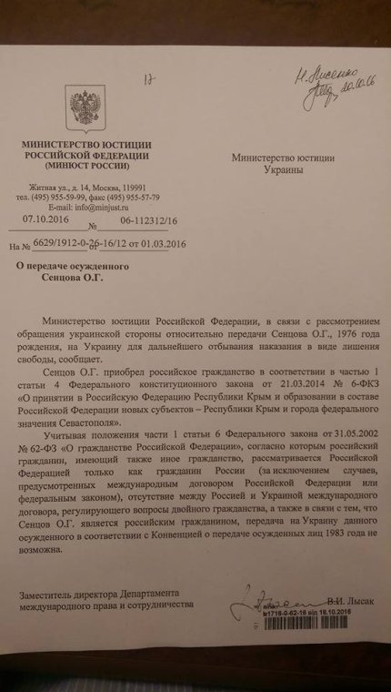 Минюст РФ прислал официальный документ, в котором выразил отказ России передавать заключенного Олега Сенцова Украине.