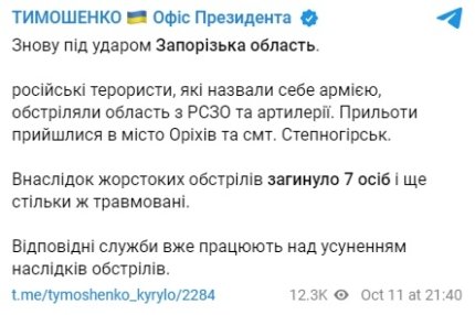 Армия Российской Федерации вечером 11 октября снова обстреляла Запорожскую область из РСЗО и артиллерии – погибли 7 мирных жителей, 7 человек травмированы. Об этом сообщил заместитель руководителя Офиса президента Кирилл Тимошенко.