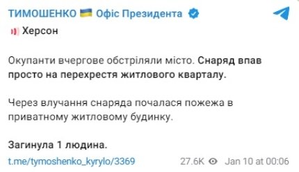 9 января российские войска обстреляли жилой квартал Херсона. Один человек погиб, один получил ранения.