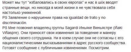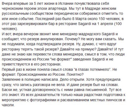 Стало известно, что член российской общины в Мадриде Анастасия Самоторова хотела организовать большую вечеринку в ресторане, однако получила отказ. При этом менеджер заведения подчеркнула, что посетители-россияне являются в нем "неформатом".