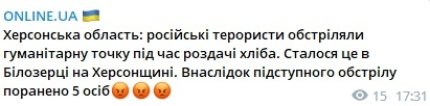 19 ноября в пгт Белозерка в Херсонской области армия Российской Федерации обстреляла гуманитарную точку во время раздачи хлеба — согласно последним данным, 5 человек получили ранения.