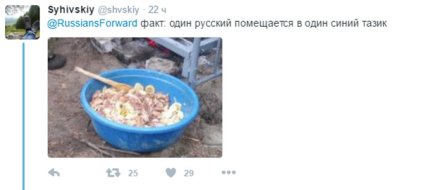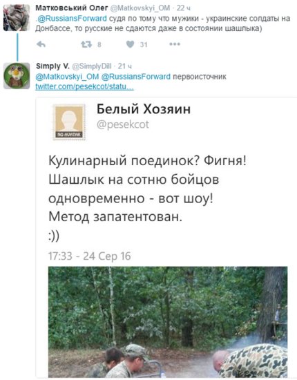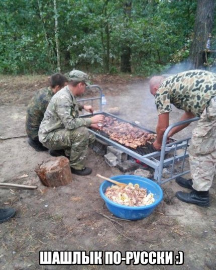 На российском аккаунте в Twitter было опубликовано фото украинских солдат, проявивших смекалку во время жарки шашлыка, при этом снимок был подписан как «русская импровизация».