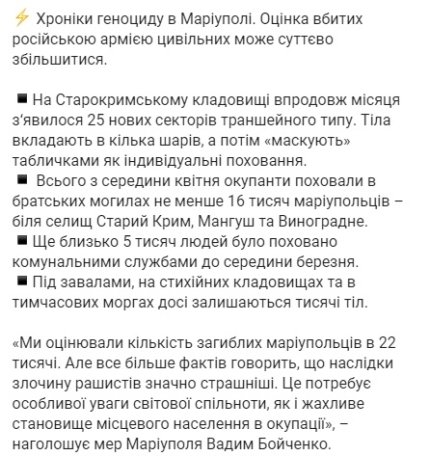 Мы оценивали количество погибших мариупольцев в 22 тысячи, но все больше фактов говорит, что последствия преступления рашистов значительно страшнее. Это требует особого внимания мирового сообщества, как и ужасающее положение местного населения в оккупации, - отметил мэр.