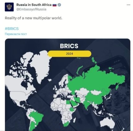 Реальность нового многополярного мира, – так подписало посольство РФ мечту о расширении БРИКС (сокращенно от Brazil, Russia, India, China, South Africa).