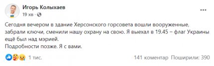 Сегодня вечером в здание Херсонского горсовета вошли вооруженные, забрали ключи, сменили охрану на свою. Я уехал в 19:45 – флаг Украины еще был над мэрией. Подробности позже. Я с вами, – сказал мэр Херсона.