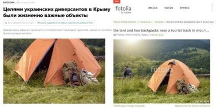 "Геббельсятина уже вообще не шифруется. Слева фото на Интерфаксе с подписью "Целями украинских диверсантов в Крыму были жизненно важные объекты". Справа фото из свободного шаринга фотографий Fotolia под названием "Тент и два рюкзака в горах". Найди 10 отличий. Или как поется в одной песенке, "Священной водой мы факты покропим: не нужно правды, правда - ложь, рашизм непобедим". Подметил баг Любомир Шкорута", - говорится в сообщении.