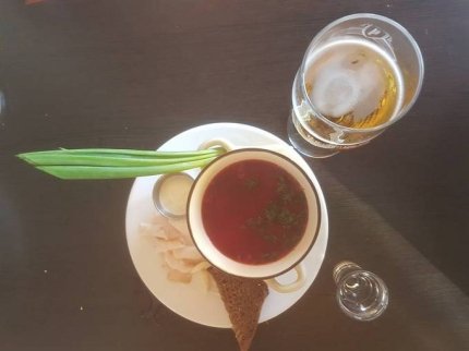 На обнародованной фотографии запечатлена тарелка борща с салом, зелёным луком, черным хлебом и солью, а также стопка водка и бокал пива.