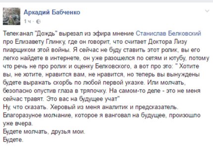 «Речь не про ролик и оценку Белковского, а вот про это: " Хотите вы, не хотите, нравится вам, не нравится, но теперь вы вынуждены будете выражать скорбь по любой первой указке. Или молчать, безопасно опустив глаза в тряпочку. На самом-то деле - это не меня сейчас травят. Это вас на будущее учат". Ну, что сказать. …ровый из меня аналитик и предсказатель. Благоразуное молчание, которое я ванговал на будущее, произошло уже вчера. Будете молчать, друзья мои», - добавил Бабченко.