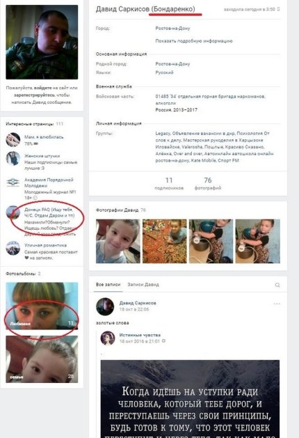 О том, что отношения между Бондаренко и Саркисовой не виртуальные говорит удаленный по состоянию на 28 октября 2016 года альбом с 11 фото жительницы Харцызска, названный "Любимая", фамилия "Бондаренко" в скобках рядом с фамилией Саркисова, а также множество донецких и пророссийских сообществ в "интересных страницах" профиля российского военнослужащего.
