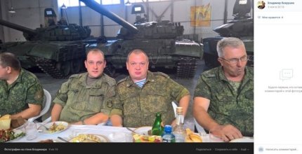 В соцсетях военнослужащего обнаружили фото застолья в заводе химреактивов в Донецке, в 7 км от Песков и в 15 км от Красногоровке, на котором сидят подполковник, капитан, майор Ватрушев в форме с петличными знаками войск радиационной, химической и биологической защиты и генерал-майор войск РФ.