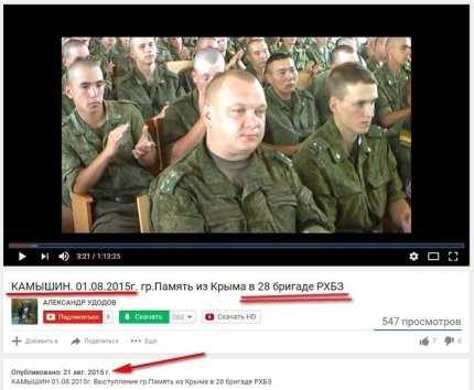 Также было найдено видео "КАМЫШИН. 01.08.2015г. группа «Память» из Крыма в 28 бригаде РХБЗ", опубликованное в youtube 21 августа 2015 года, где заснят Владимир Вахрушев сидящий в актовом зале среди других солдат войсковой части 65363.
