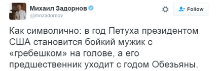 "Как символично: в год Петуха президентом США становится бойкий мужик с «гребешком» на голове, а его предшественник уходит с годом Обезьяны".