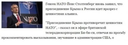 При этом фраза о "присоединении Крыма" подается не как вольный пересказ слов Столтенберга, а как прямая цитата.
