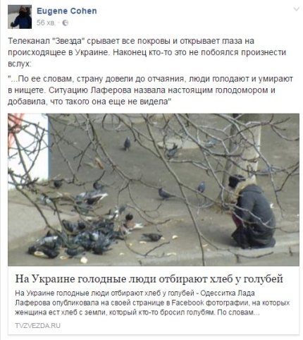 Роспропагандисты в материале под названием "В Украине голодные люди отбирают хлеб у голубей" ссылаются на публикацию одесситки Лады Лаферовой, которая рассказала историю о женщине, начавшей есть хлеб предназначавшийся для уличных голубей.