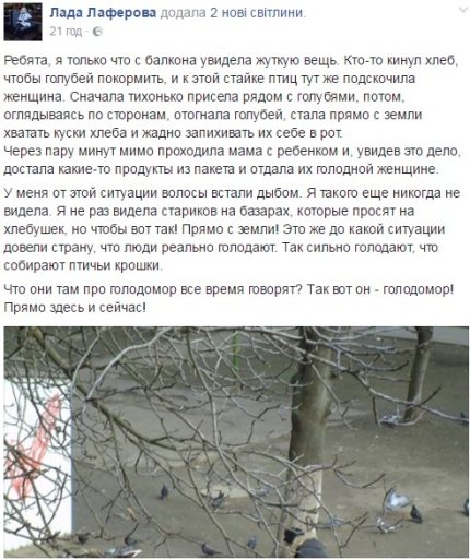 "Сначала тихонько присела рядом с голубями, потом, оглядываясь по сторонам, отогнала голубей, стала прямо с земли хватать куски хлеба и жадно запихивать их себе в рот. Через пару минут мимо проходила мама с ребенком и, увидев это дело, достала какие-то продукты из пакета и отдала их голодной женщине. У меня от этой ситуации волосы встали дыбом. Я такого еще никогда не видела. Что они там про голодомор все время говорят? Так вот он - голодомор! Прямо здесь и сейчас!", - написала одесситка.