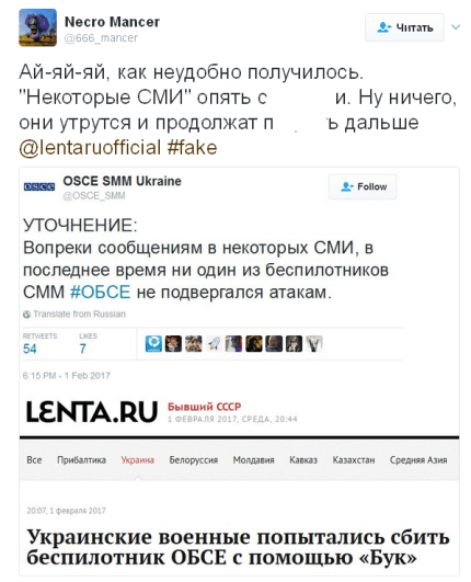 Как сообщает пользователь Twitter-аккаунта Necro Mancer, пресс-служба ОБСЕ официально опровергла заявления "некоторых СМИ" из России о том, якобы украинцы "попытались сбить беспилотник ОБСЕ".