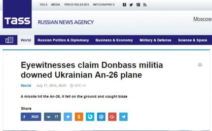 «Недавно я давал ссылку на англоязычную версию сайта российского агентства ТАСС, где до сих пор висит новость от 17 июля 2014 о том, что «ополченцы» сбили Ан-26 (на самом деле малазийский "Боинг")?» — напомнил он.