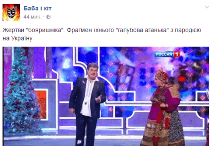 Российский телеканал "Россия 1" транслировал "новогодний огонек", в одном из номеров которого была показана пародия на отношения России и Украины. Российская певица Надежда Бабкина пела от имени "России", а актер, судя по прическе загримированный под Порошенко, исполнял роль "Украины".