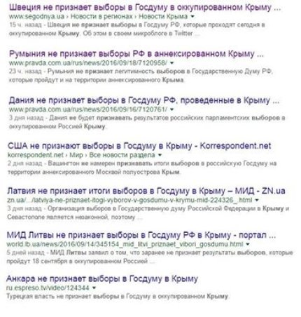 «Я вам щас махровой русофобии покажу», - написала пользователь Twitter «Непогана_Тетяна» и опубликовала скриншот с подборкой заголовков новостей о непризнании выборов в Государственную думу России в оккупированном Крыму.