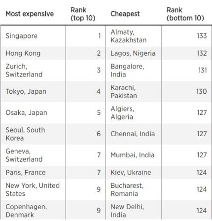 В первую десятку самых дорогих городов вошли: Сингапур, Гонконг, Цюрих, Токио, Осака, Женева, Париж, Нью-Йорк и Копенгаген.