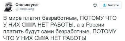 Отметим, что такие планы российского правительства вызвали бурную реакцию пользователей соцсетей. Так, пользователь Сталингулаг написал: "В мире платят безработным, ПОТОМУ ЧТО У НИХ С**А НЕТ РАБОТЫ, а в России платить будут сами безработные, ПОТОМУ ЧТО У НИХ С**А НЕТ РАБОТЫ".
