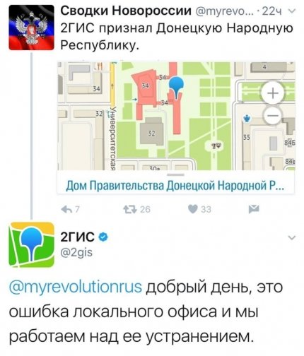 Так, 2ГИС обозначил бывшее здание Донецкой ОГА как Дом Правительства Донецкой Народной Республики — все с большой буквы и без всяких кавычек. Боевики обрадовались и написали в "Сводках Новороссии", что 2ГИС признал ДНР. Позднее появилось сообщение от сервиса, что это ошибка локального офиса.