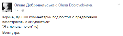 Блогер Антон Ходза написал: "В Фейсбуке активно форсят украинско-российский завтрак на границе. А на какой границе он будет? На границе ОРДИЛО и России, через который еженедельно танки и снаряды возят, которые убивают украинцев? Или на границе с Крымом, который у нас отжали? Или на границе с Приднестровьем, откуда российские части на Одессу пойдут в случае большой заварухи? Или на границе с Беларусью, откуда также россияне в случае чего повалят? Или на границе с Россией, которую мы сейчас контролируем, но и там уже базы строят? На какой б***ь границе будет этот завтрак примирения?".