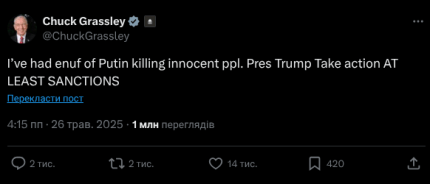 С меня хватит, что Путин убивает невинных людей. Президент Трамп, прибегните к мерам, хотя бы к санкциям, — призвал Грассли, выступая с публичной критикой обострения российской агрессии.