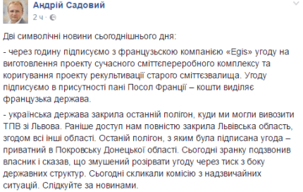 Садовой сообщил, что 17 марта подписывает с французской компанией «Egis» соглашение на изготовление проекта современного мусороперерабатывающего комплекса и корректировки проекта рекультивации старой свалки.