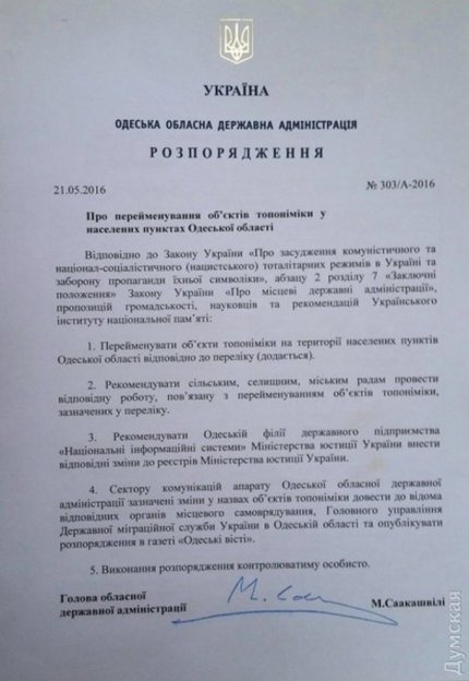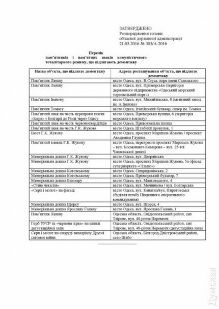 Как говорится в тексте нового распоряжения Саакашвили о декоммунизации, в Одессе необходимо снести ряд памятников: двух оставшихся Лениных (в парке Савицкого и на территории бывшего судоремонтного завода), всех Жуковых, памятники Иванову, Томасу, памятные знаки в честь красногвардейцев и газеты "Искра", мемориальные доски Котовскому, Блюхеру, Щорсу, Галану. Кроме того, фасад штаба Южного оперативного командования лишится серпов и молотов, а угол Мечникова и Болгарской - "стены чекистов".