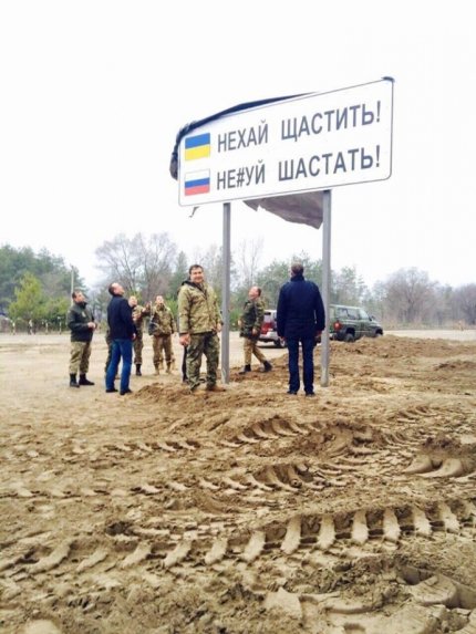 На фотографиях Саакашвили позирует на фоне указателя, где рядом с украинским флагом написано "Нехай щастить", а ниже — "перевод" этой фразы по-русски: "Не#уй шастать" с изображением российского флага.