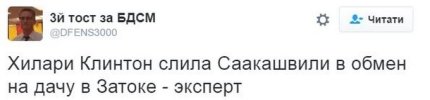 Пользователь 3й тост за БДСМ, в свою очередь, предположил, что к отставке Саакашвили причастна кандидат в президенты США от Демократической партии Хиллари Клинтон: "Хилари Клинтон слила Саакашвили в обмен на дачу в Затоке - эксперт".
